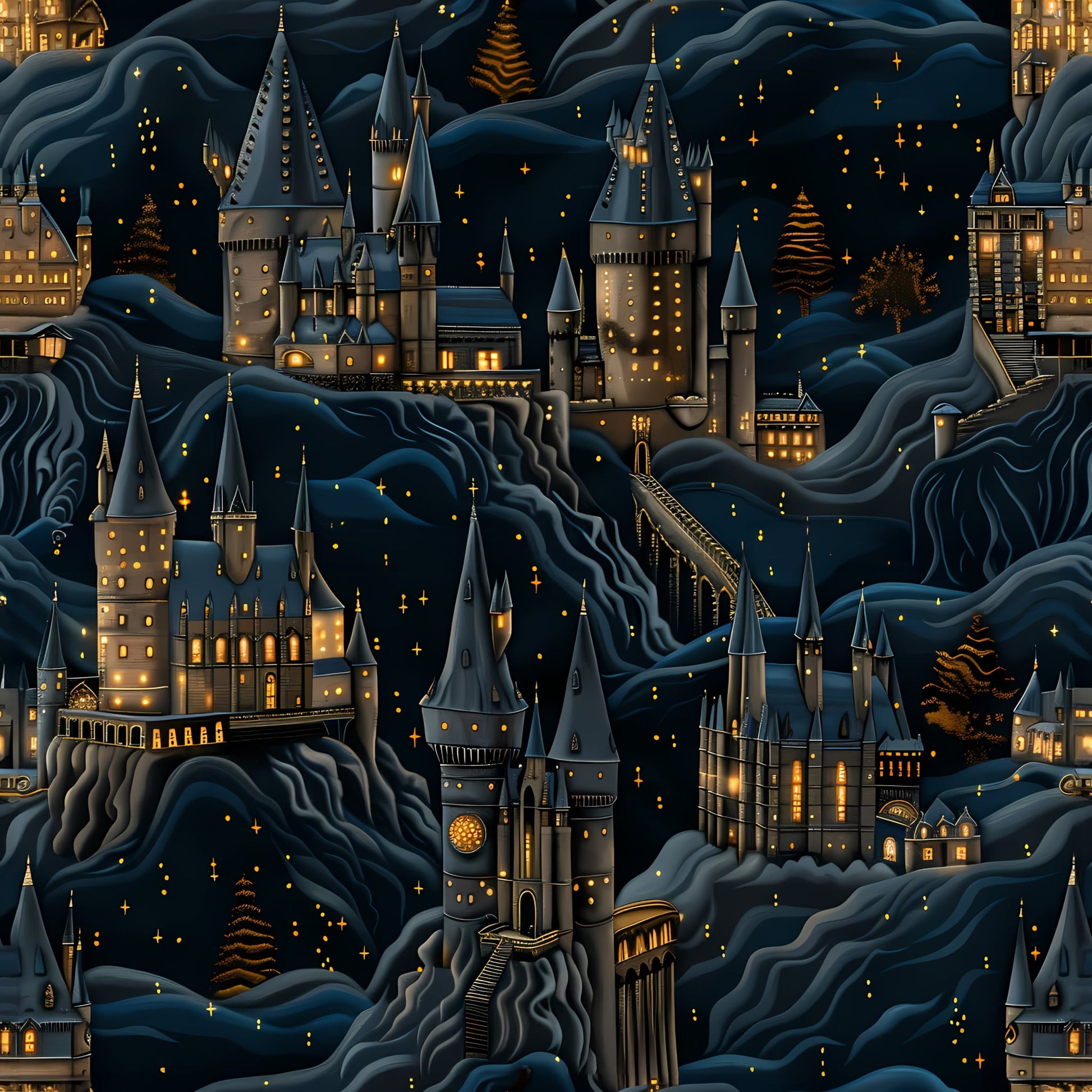 6. Enchanted Castle – magical castle silhouette under a starry night sky, dreamy and bold.